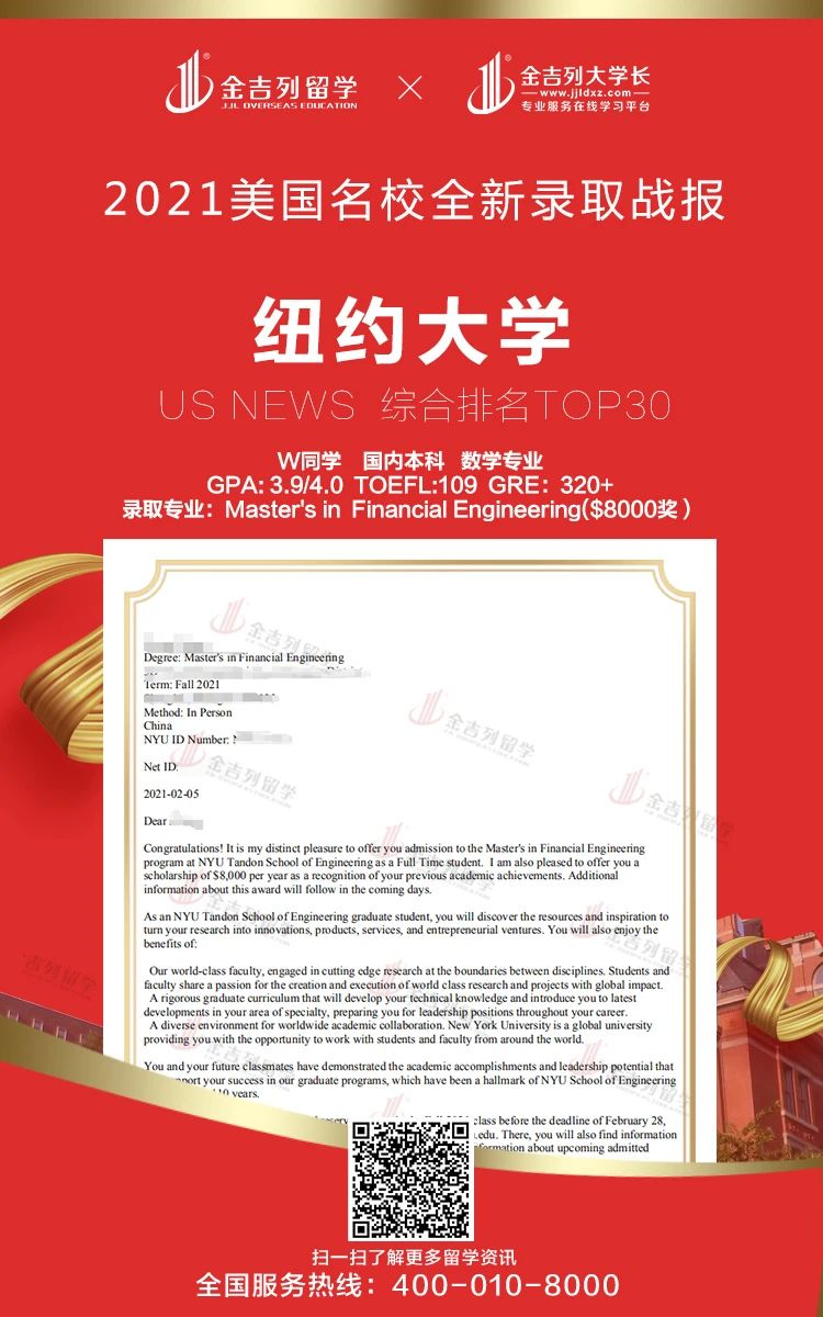 尚书有云:功崇惟志,业广惟勤 。 2021年秋季海外留学申请录取进行时,感谢各位同学和家长的支持、配合、理解和包容,感谢整个申请团队的辛苦付出。 只要你足够优秀,我们会让你更优秀,最后也希望各位同学不负师教,学业有成,事业有成!金吉列留学 录取offer集锦包含了全球名校本科新生、本科转学、研究生、博士申请数据,非高端院校录取数据除外,个人信息部分均已保护。 可供今年和明年申请出国留学的同学参考,世界名校竞争激烈,申请难度大,早准备,早规划,早申请,早录取,结果一定不会差。