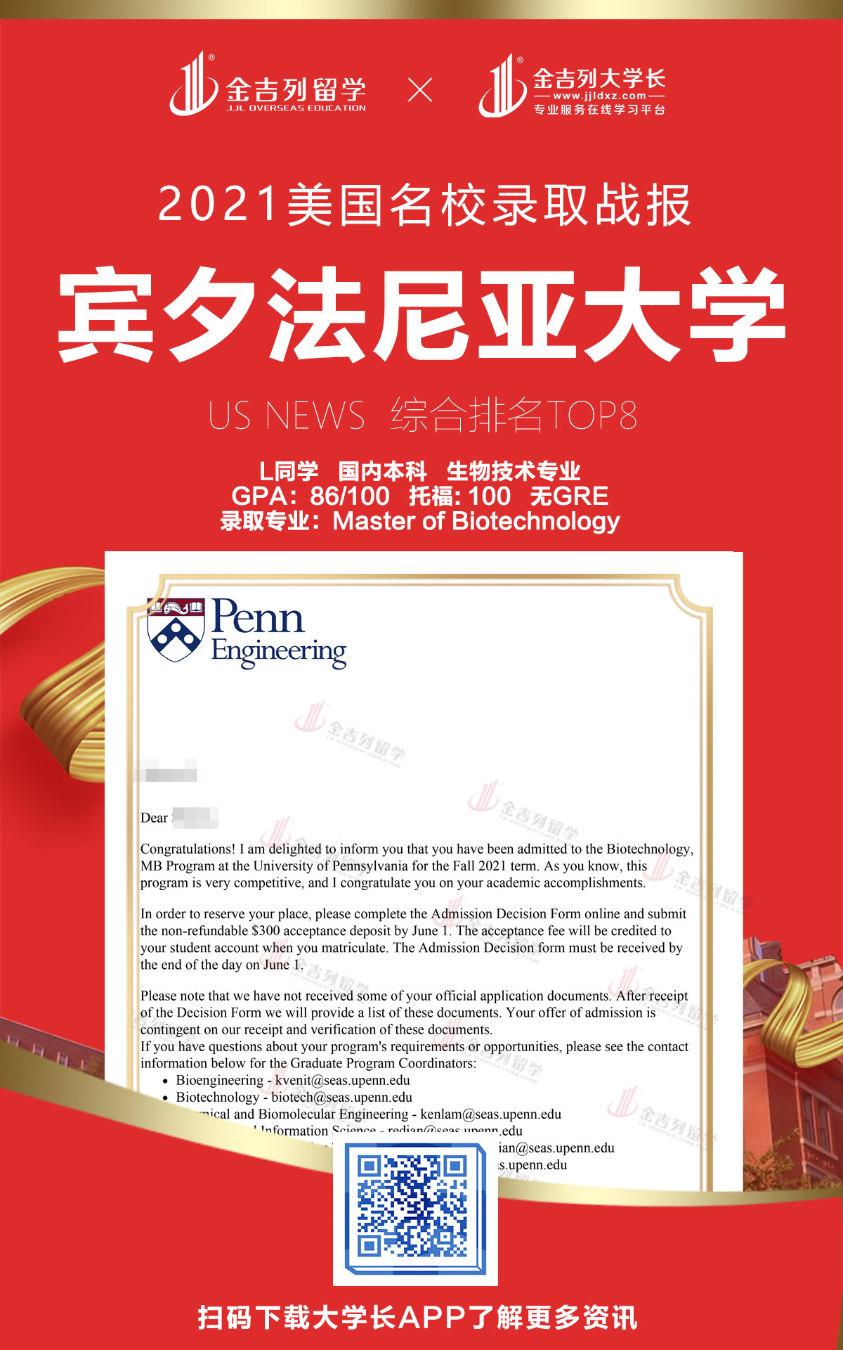宾夕法尼亚大学生物科技(免G)专业录取!