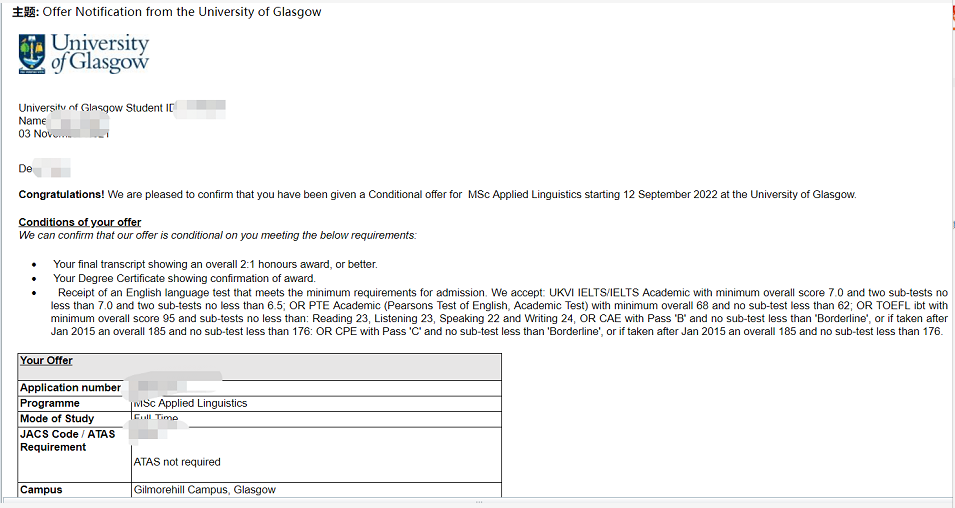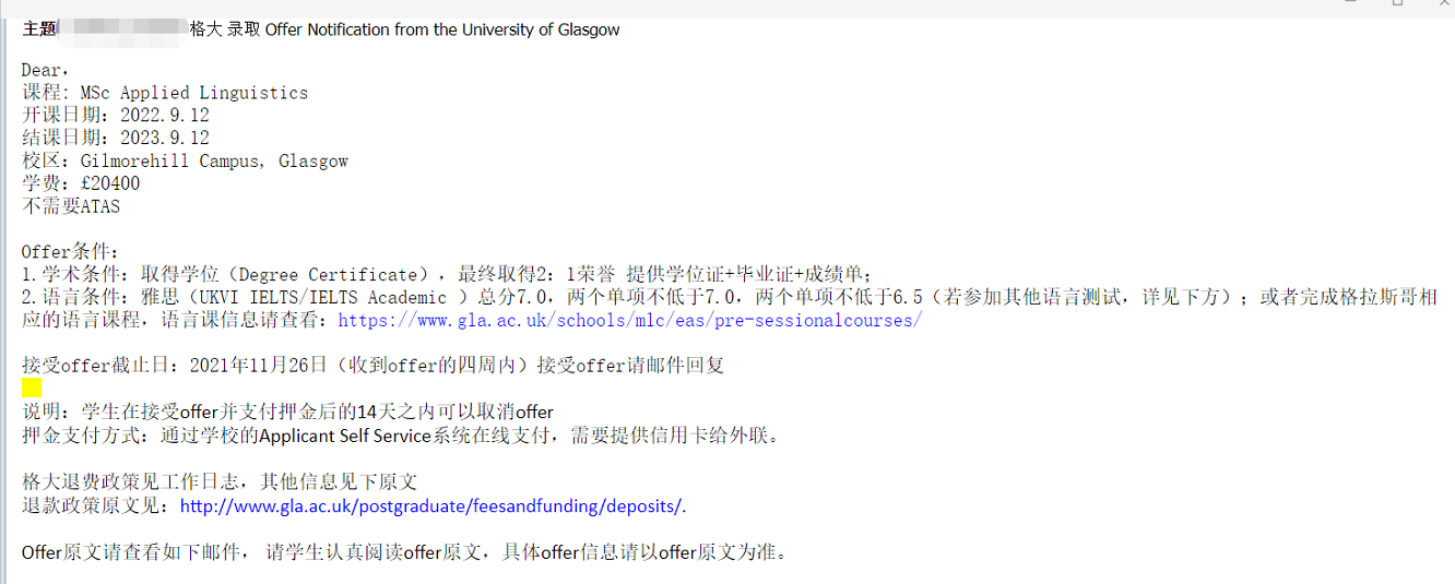 学生背景:河北师范大学,翻译专业,均分85+,录取格拉斯哥大学应用语言学专业。
