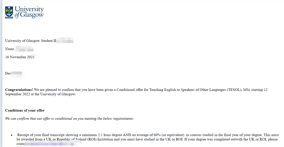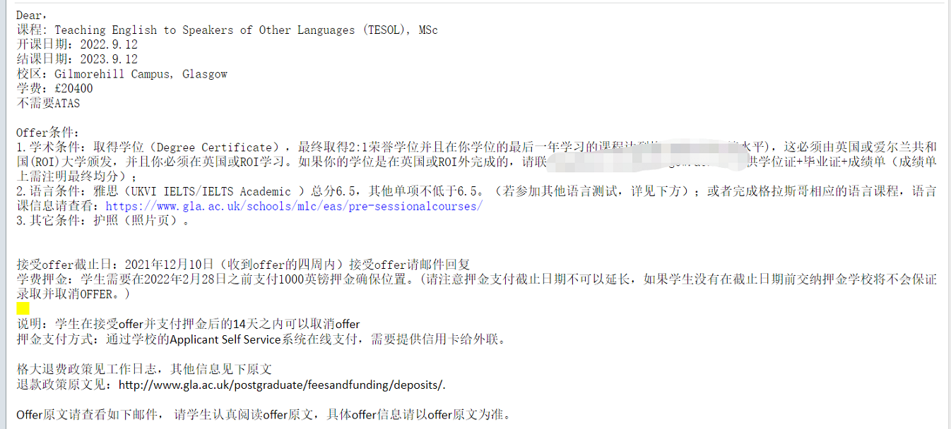 学生背景:河北师范大学,翻译专业,均分85+,录取格拉斯哥大学TESOL 专业,OFFER详情见下图。