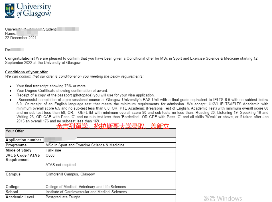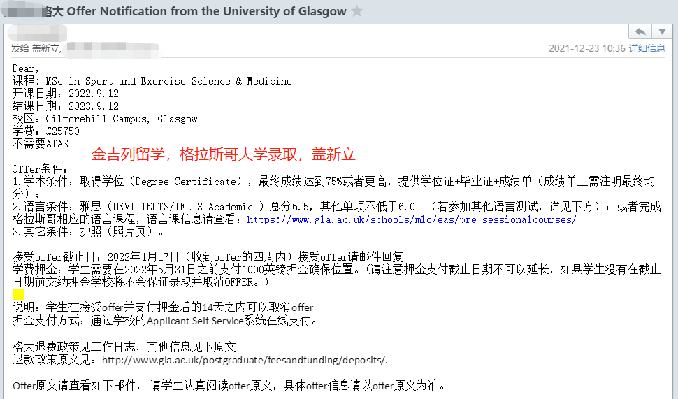 学生背景:河北师范大学,民族体育专业,均分80,申请时无雅思,录取格拉斯哥大学运动医学专业。