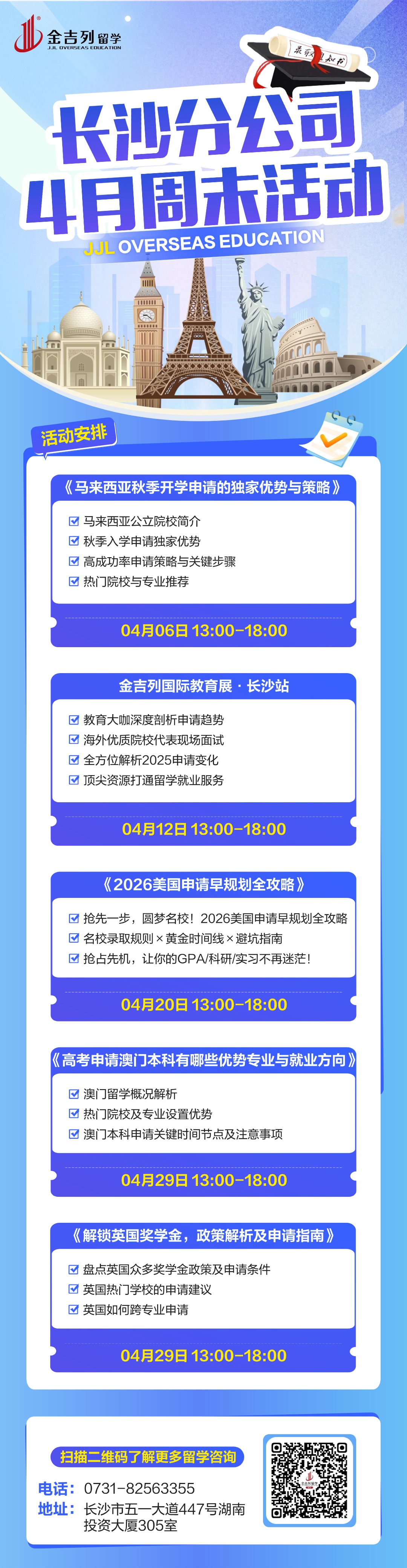 每周末13:00-18:00,相约金吉列留学长沙分公司,听留学时讯、做申请规划、获行前攻略、享海外生活,精彩多多,不容错过!