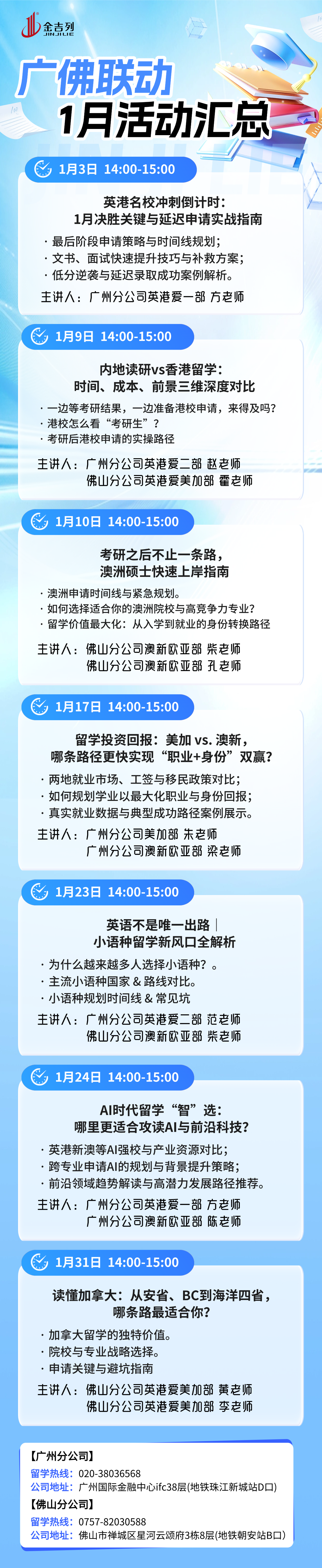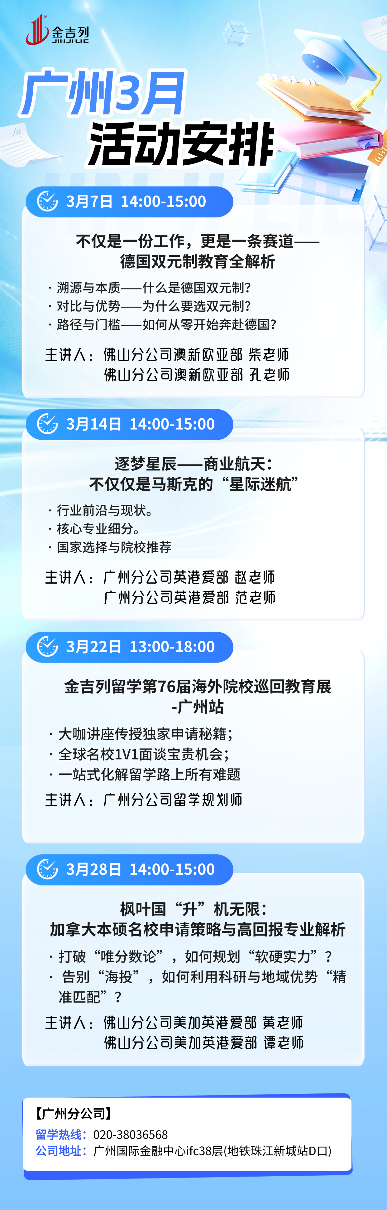 每周末13:00-18:00,相约金吉列留学广州分公司!听留学时讯、做申请规划、获行前攻略、享海外生活,精彩多多,不容错过!