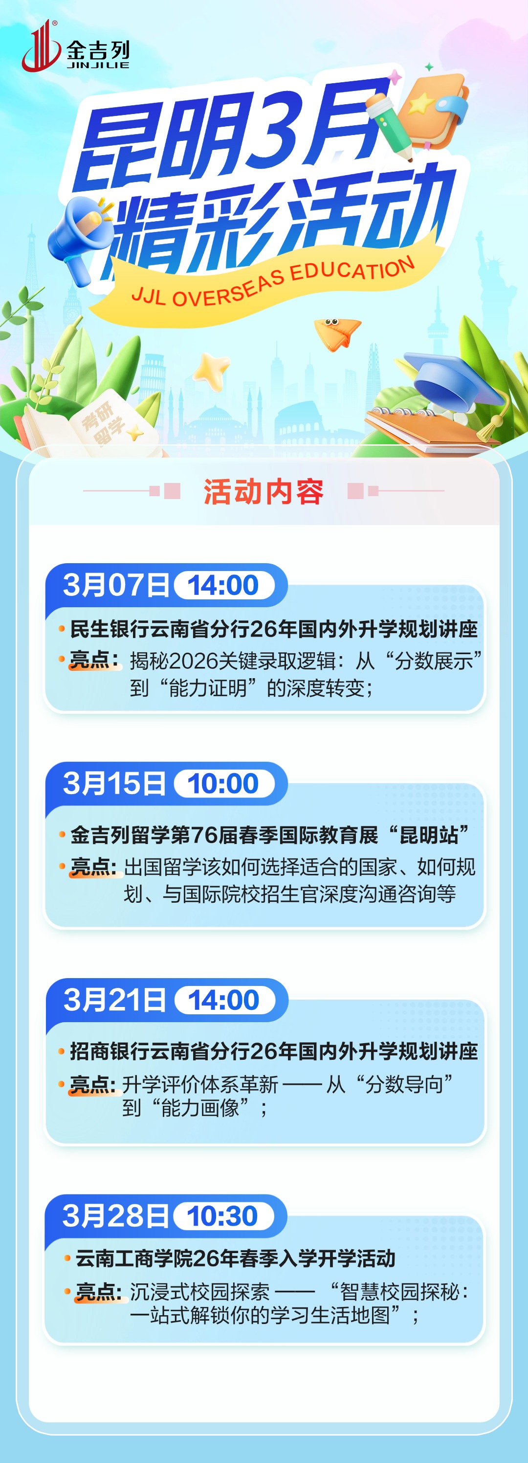 1、民生银行云南首分行私行部26年国内外升学指导讲座;2、金吉列留学第76届春级国际教育展“昆明站”;3、招商银行云南首分行2026年国内外升学规划讲座;4、云南工商学院26年春季入学开学活动