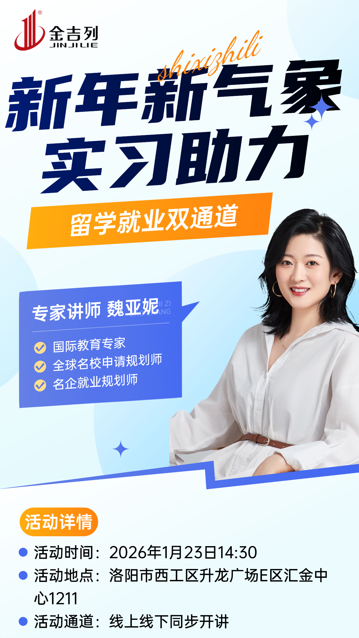 2026年1月24日14:30将举办讲座《新年新气象—实习助力留学就业双通道》,特邀讲师金吉列留学规划专家魏亚妮老师。感兴趣的小伙伴可以关注一下。