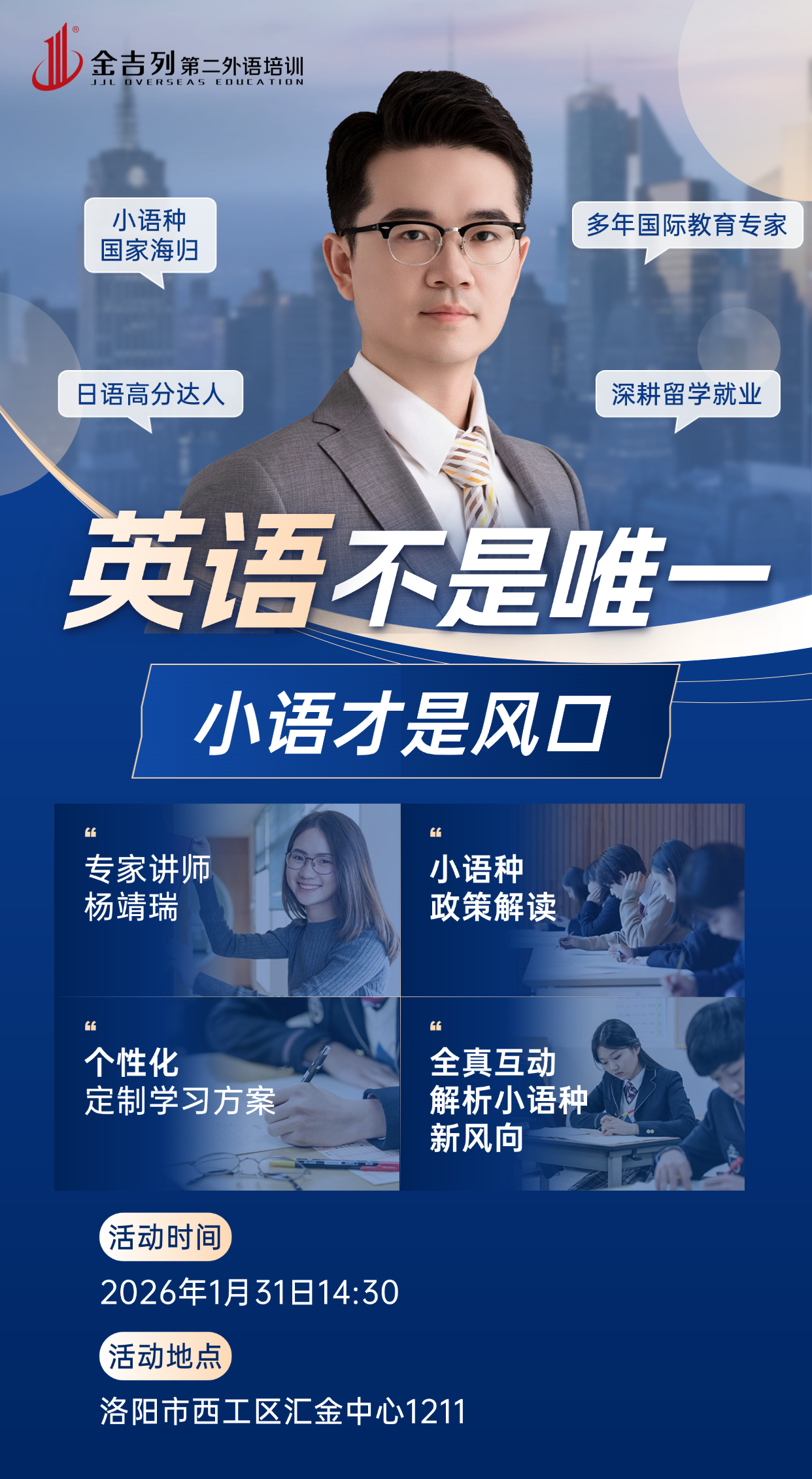 2026年1月31日14:30将举办讲座《英语不是唯一,小语才是风口》,特邀专家讲师杨靖瑞老师金吉列。感兴趣的小伙伴可以关注一下。