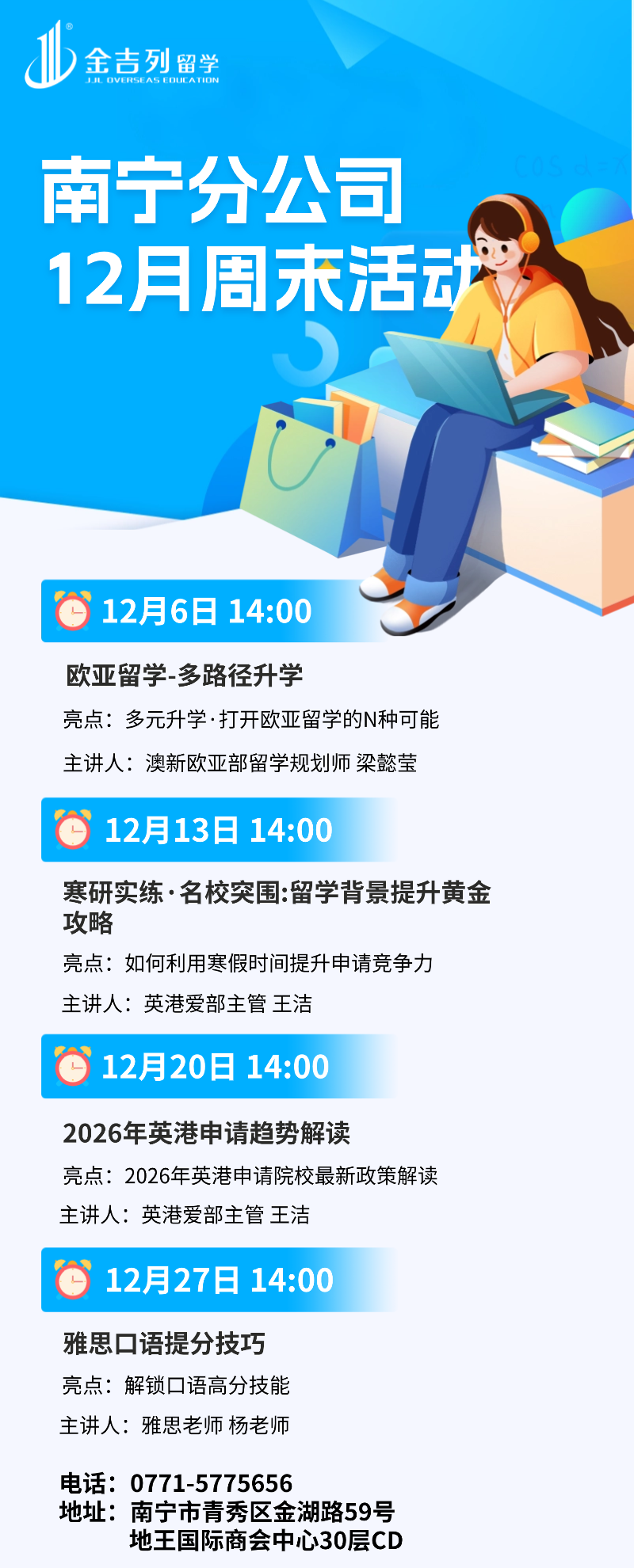 活动地址:金吉列留学南宁分公司(南宁市青秀区地王大厦30层CD)预约方式: