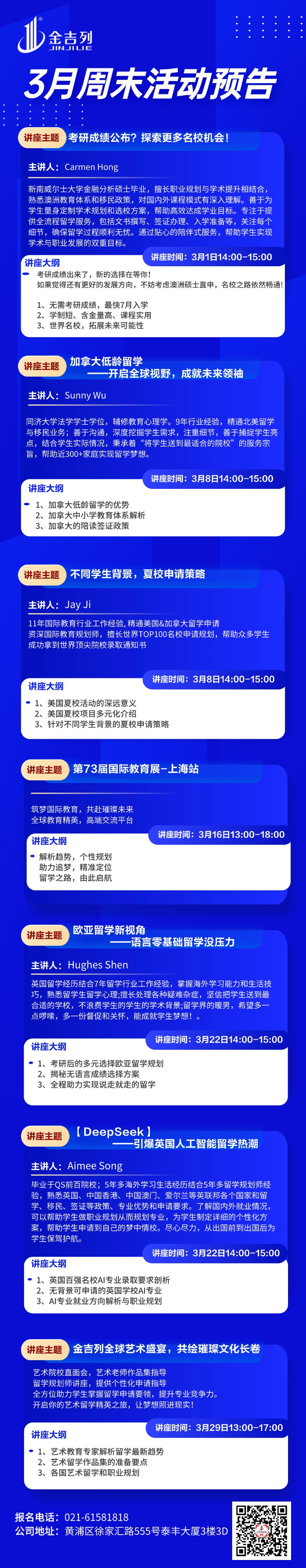 为考研后学生、意向美国/加拿大/澳大利亚/欧亚地区学生、艺术生、计划申请暑期夏校学生、低龄留学生,提供专业申请解析,并提供校方面对面沟通机会及艺术生作品集现场指导。