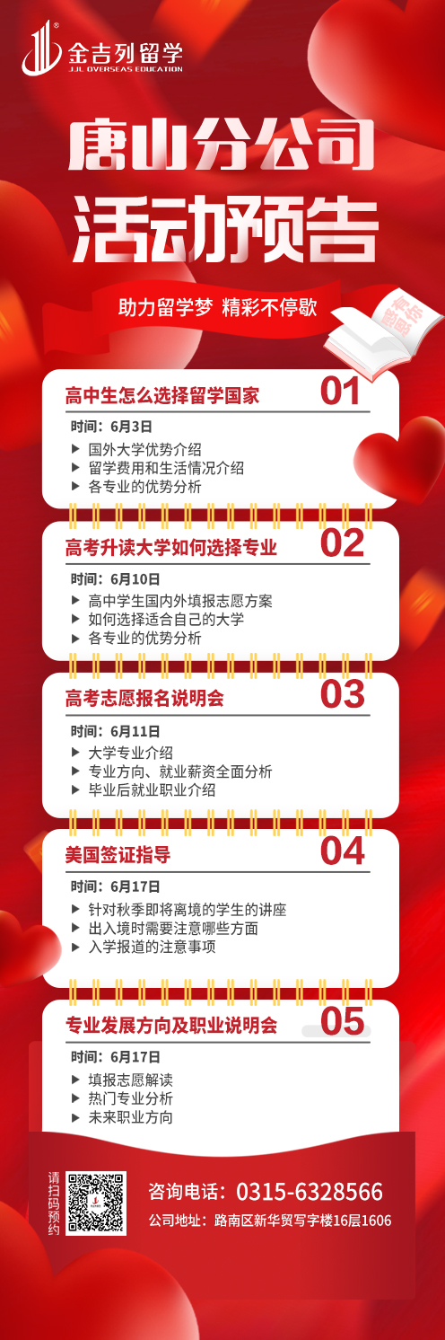 金吉列留学唐山分公司近期推出了一系列周末活动,欢迎各位学生及家长参加!