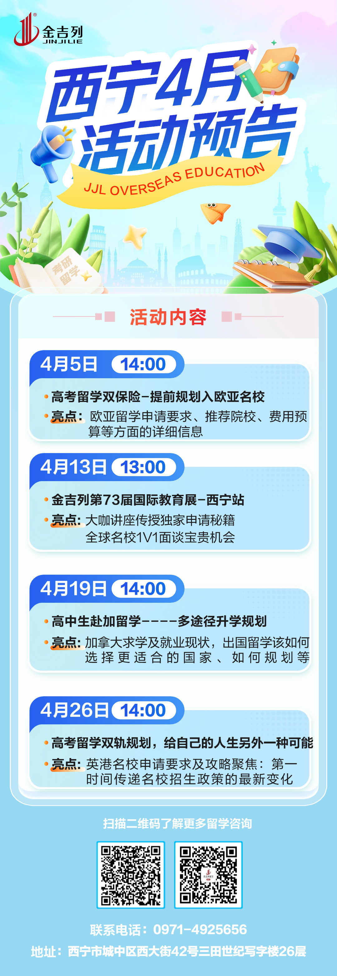 活动地址:金吉列留学西宁分公司(西宁市城中区西大街42号三田世纪写字楼26层)