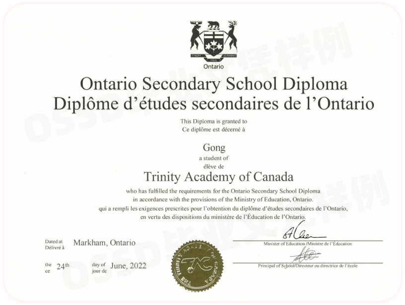 OSSD全称为:加拿大安大略省高中文凭 (Ontario Secondary School Diploma)。由加拿大安大略省教育厅设立,是加拿大最权威的教育体系,世界最高质量的非应试类中学教育体系,世界先进的中学课程体系之一。受美国、加拿大、英国、澳大利亚顶尖大学官方认可,是进入世界一流大学的通用文凭。